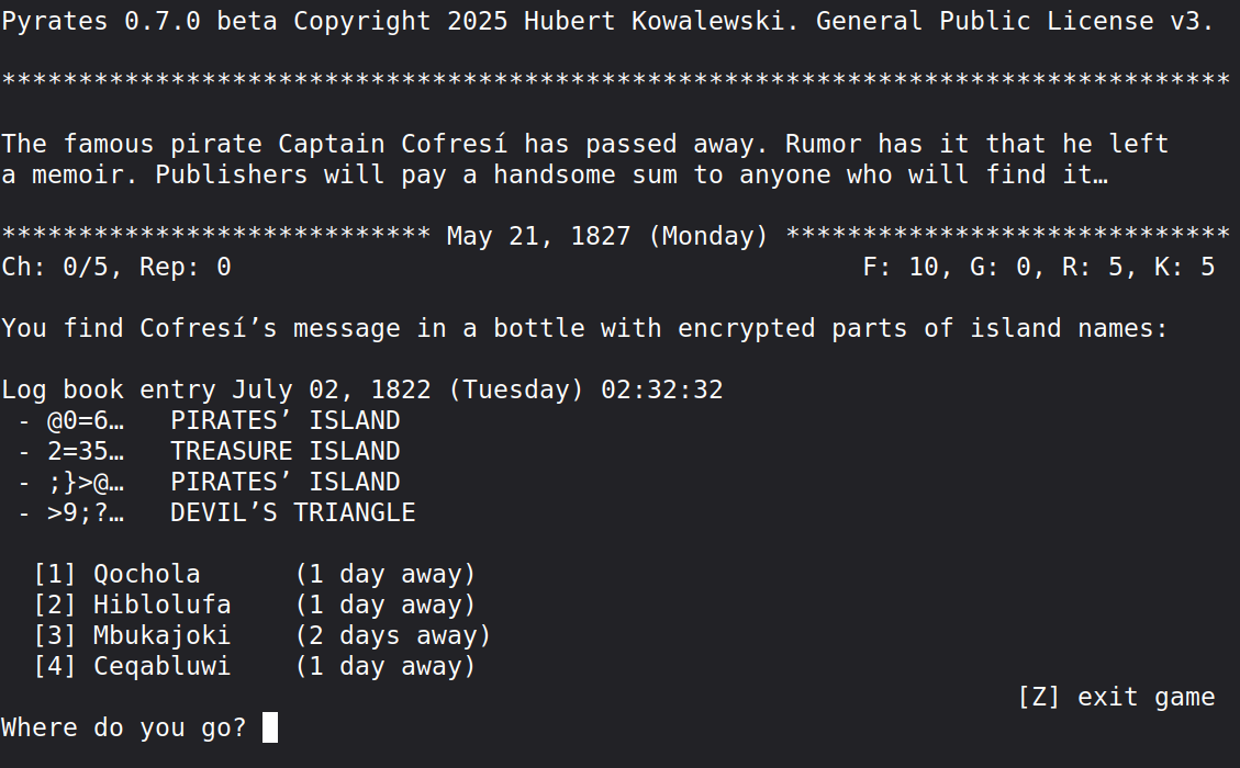 In order to run the game, you need to have Python 3 (> 3.7) installed on you computer. You can run the game in terminal by typing 'python3 pyrates.py' or by double-clicking the file 'pyrates.py' on Windows.